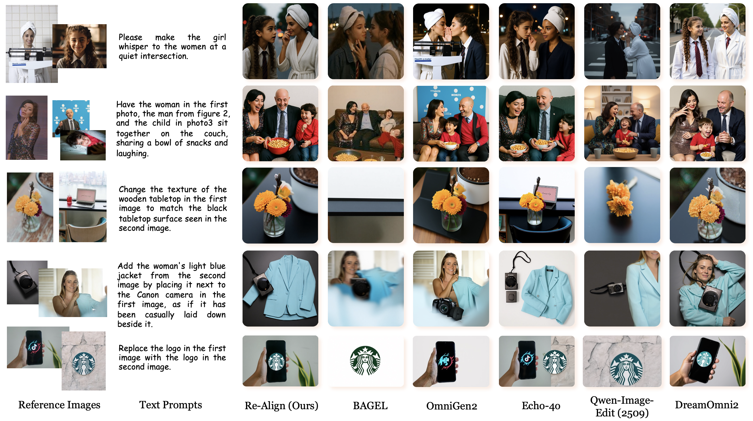 Qualitative comparisons of proposed Re-Align with BAGEL, OmniGen2, Echo-4o, Qwen-Image-Edit(2509) and DreamOmni2 on the in-context image generation and editing tasks.