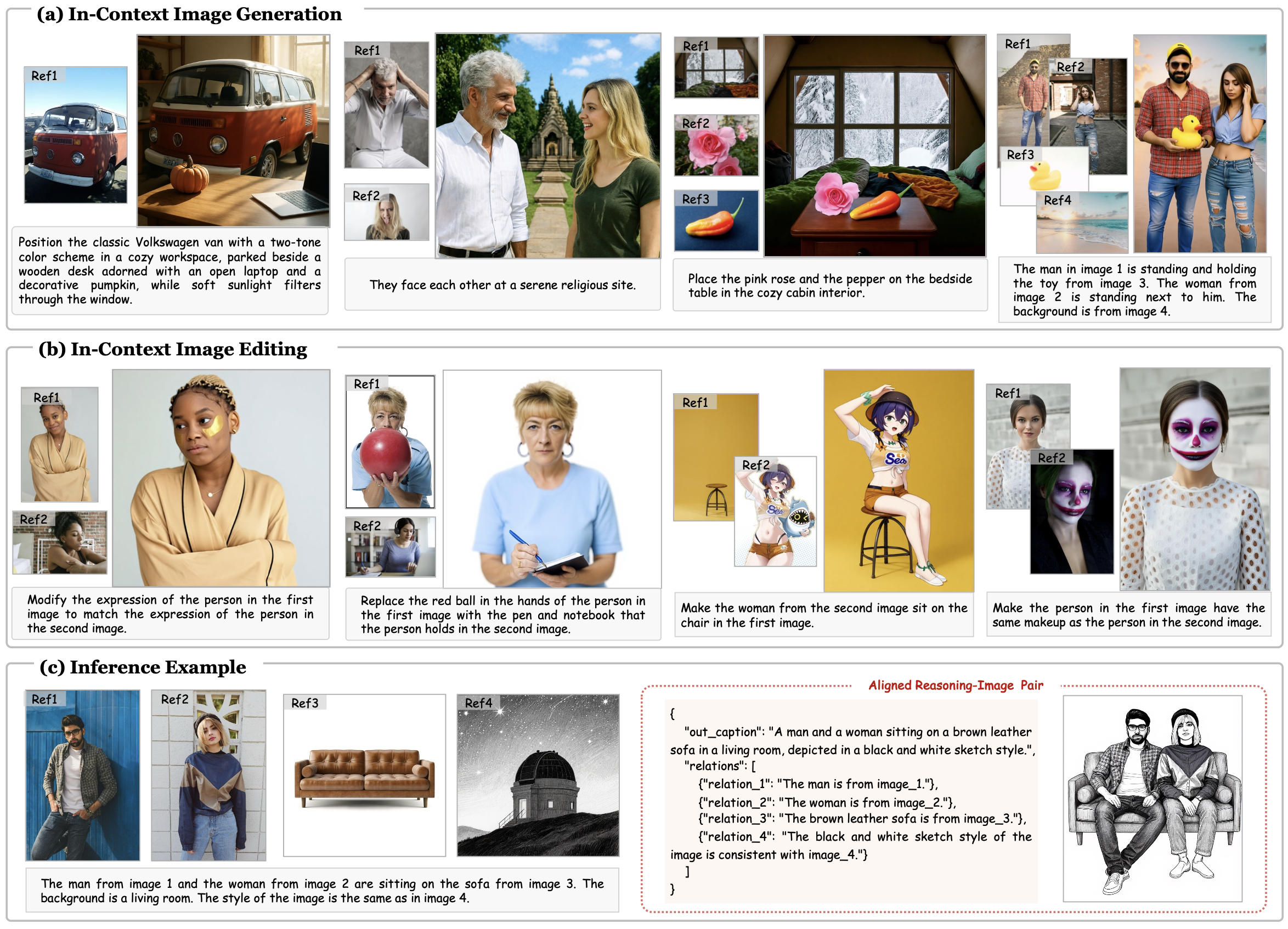 Our proposed Re-Align supports image synthesis conditioned on flexible image-text interleaved prompts, namely a) in-context image generation, also referred to as subject-driven image generation, and b) in-context image editing, also referred to as reference-based image editing. c) An inference example from Re-Align, including an aligned reasoning–image pair. The reasoning text is converted from XML to JSON for clearer visualization.