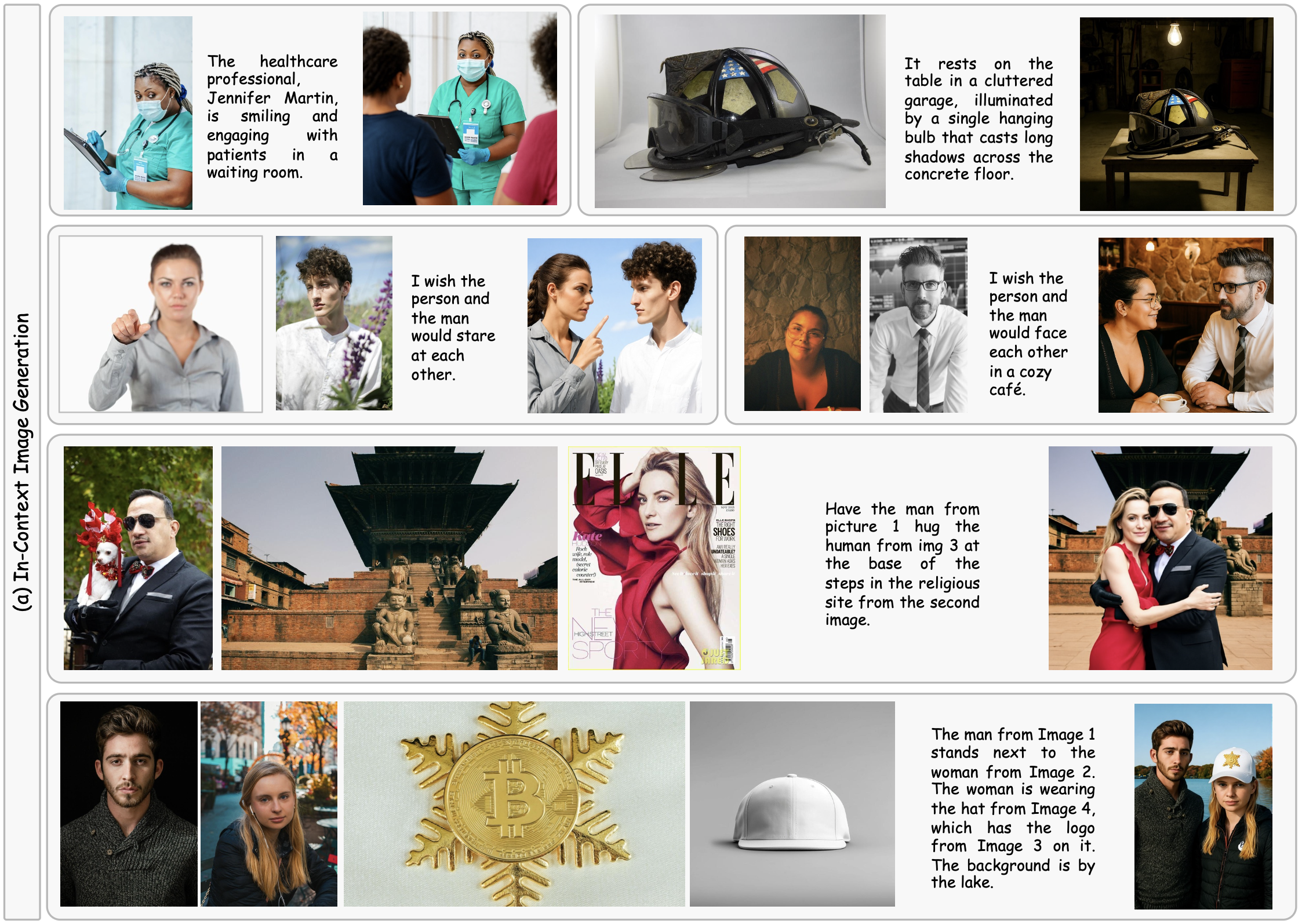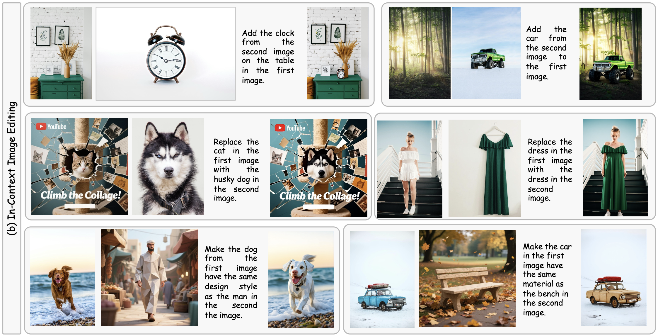 Figure(a) provides additional incontext image generation and editing examples, demonstrating that the model produces accurate and highly consistent images when conditioned on one to four reference inputs. Furthermore, Figure(b) showcases in-context image editing capabilities, where the first, second, and third rows illustrate object addition, object replacement, and attribute modification with reference images, respectively. These results underscore the strong versatility and effectiveness of Re-Align across a broad range of creative generation tasks.