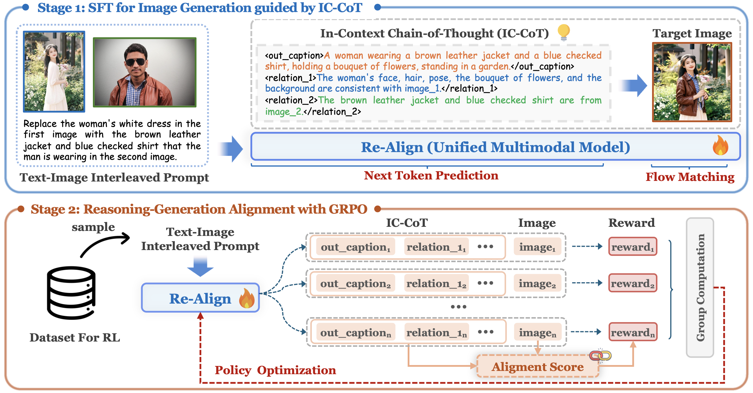 The two-stage training pipeline of Re-Align. Upper: First, we perform supervised fine-tuning on carefully curated training data to enable the model to generate images guided by IC-CoT reasoning. Lower: Next, we apply policy optimization to further enhance reasoning–generation consistency, using an alignment score between the structured IC-CoT and the corresponding generated image.